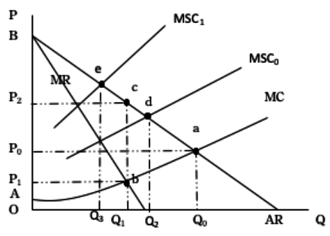 - 上圖,橫軸為數量Q,縱軸為價格P。MC為邊際成本,AR為平均收益,MR為邊際收益,且考量外部成本後之邊際社會成本為MSC。