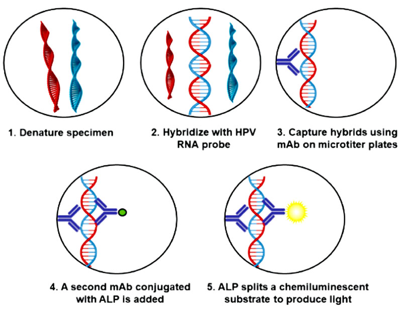 原理是免疫色層分析法,先將對抗流感病毒抗體固定在醋酸纖維試紙上,運用流體帶動檢體,結合後利用酵素呈色反應。這類試驗優點是操作簡單、報告快;缺點是病毒量低時易造成偽陰性。 HN Ab + HN HN Ab—HN HN Ab-HN—HN-2抗—Alkaline phosphatae +受質 (pNpp, para-nitro-phenol-phosphate) p-nitro-phenol (A410, 呈黃色)。